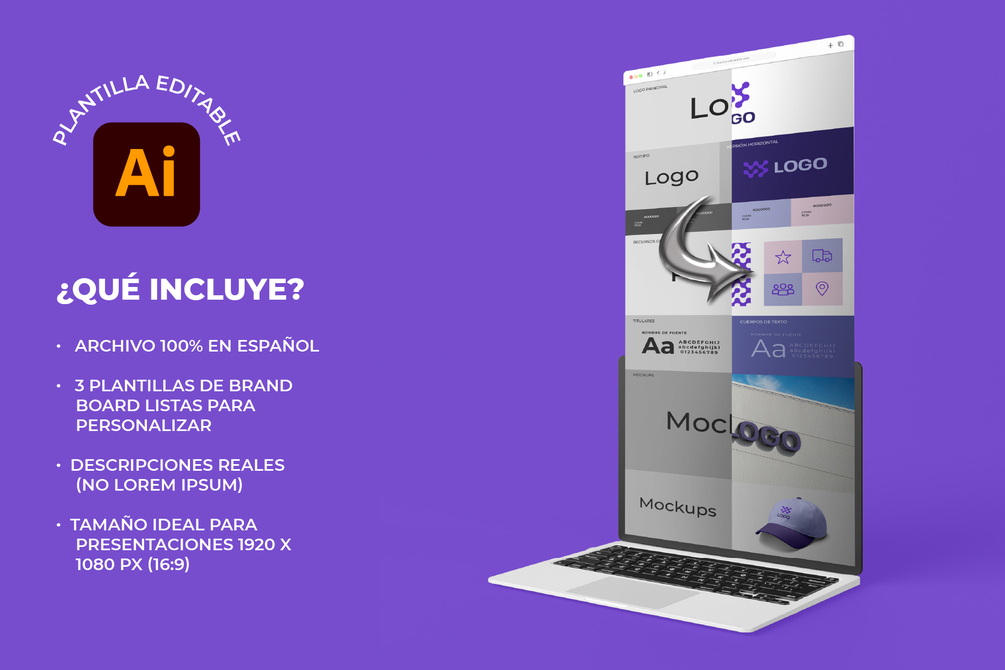 Organiza y presenta la identidad visual de una marca de forma profesional y rápida. Ideal para diseñadores, freelancers o estudios creativos que trabajan en branding.