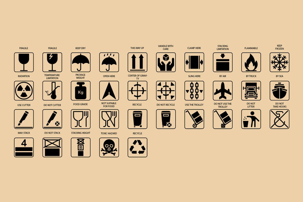 This set includes icons for Packaging signs or packaging symbols. Packaging symbol standard and care pack.