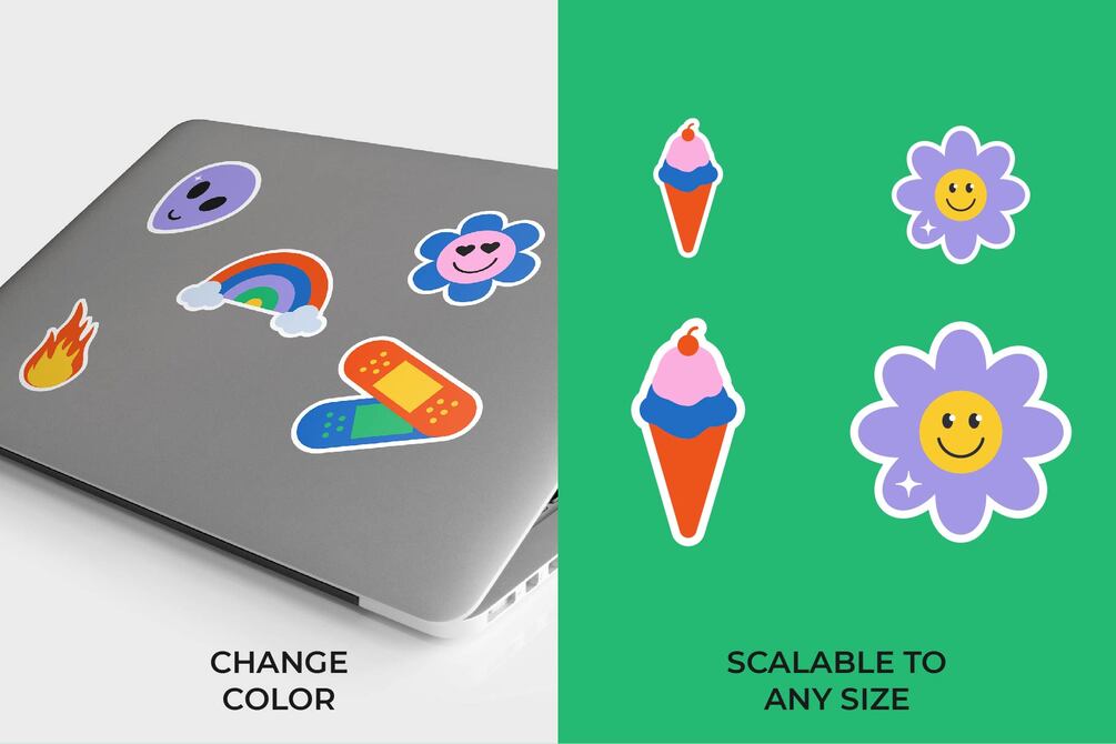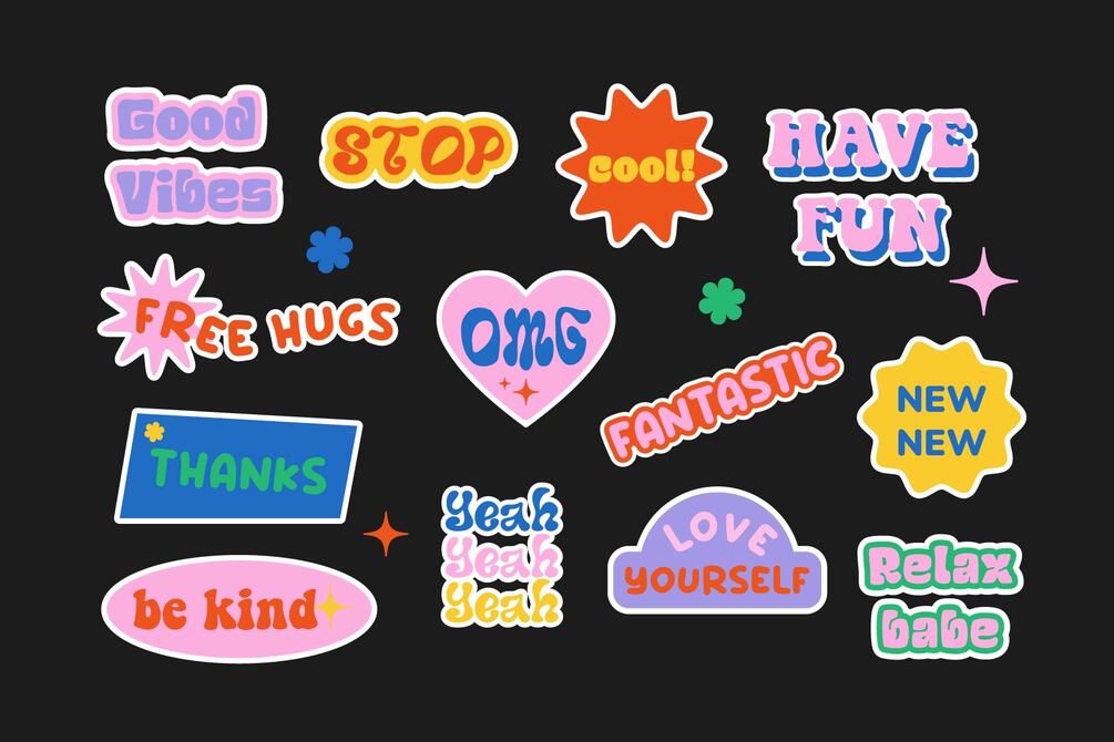 Pack of 33 stickers. High quality vector graphic elements. This collection includes vectors with 13 text stickers,18 Clipart and 3 backgrounds.
